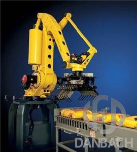 食品碼垛機器人,主要用于面粉、糕點、糧油等生產線上的碼垛及拆垛,把已包裝的料箱按定的排列模式自動編組、自動堆碼成所需垛形以便擺放和運輸,并配置有定量灌包、金屬檢測和重量檢測功能。
