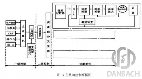 (2) 主從控制系統(Master-slave Control System):采用主、從兩處理器實現系統的全部控制功能。主CPU(上位機)實現管理、坐標變換、軌跡生成和系統自診斷等;從CPU(下位機)實現所有關節的動作控制。其構成框圖,如圖3所示。主從控制方式系統實時性較好,適于高精度、高速度控制,但其系統擴展性較差,維修困難。