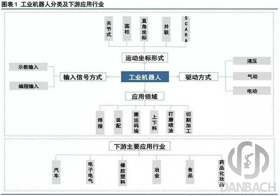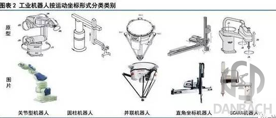 工業機器人可以按照程序輸入方式、運動坐標形式、驅動方式、應用領域等四個方面進行分類。按程序輸入方式區分有編程輸入型和示教輸入型兩類;按運動坐標形式分為關節式機器、圓柱坐標機器人、直角坐標機器人、并聯機器人、平面關節型機器人等五種;按驅動方式分為液壓驅動、氣壓驅動、電氣驅動等;從應用領域來看,主要有焊接、裝 配、搬運碼垛、上下料、打磨噴涂、切割加工機器人等。